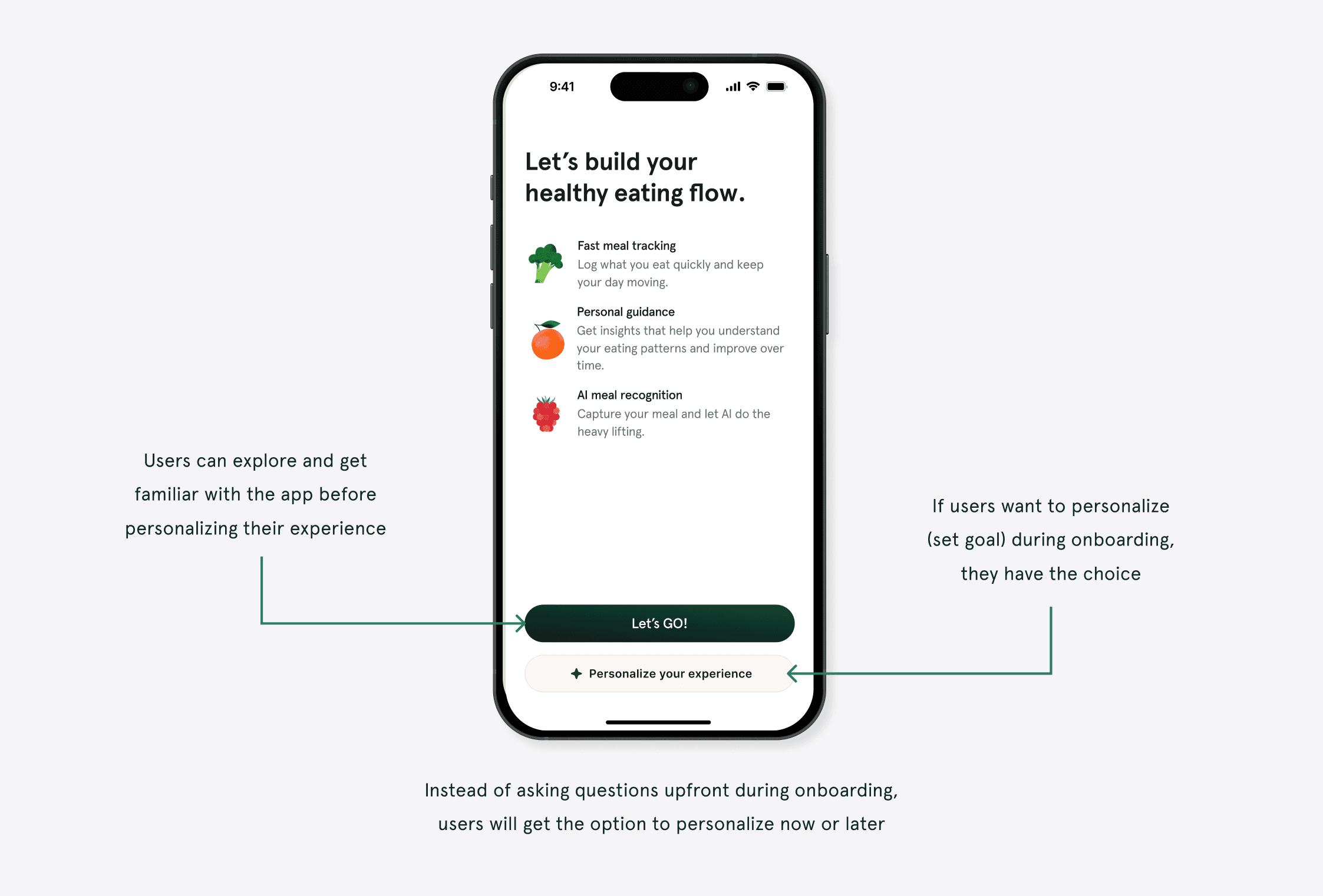 During the research phase, it became clear that many existing food tracking apps rely on long and monotonous onboarding flows. These experiences often demand too much effort from users at an early stage, leading to frustration and a higher likelihood of users dropping off before fully engaging with the app