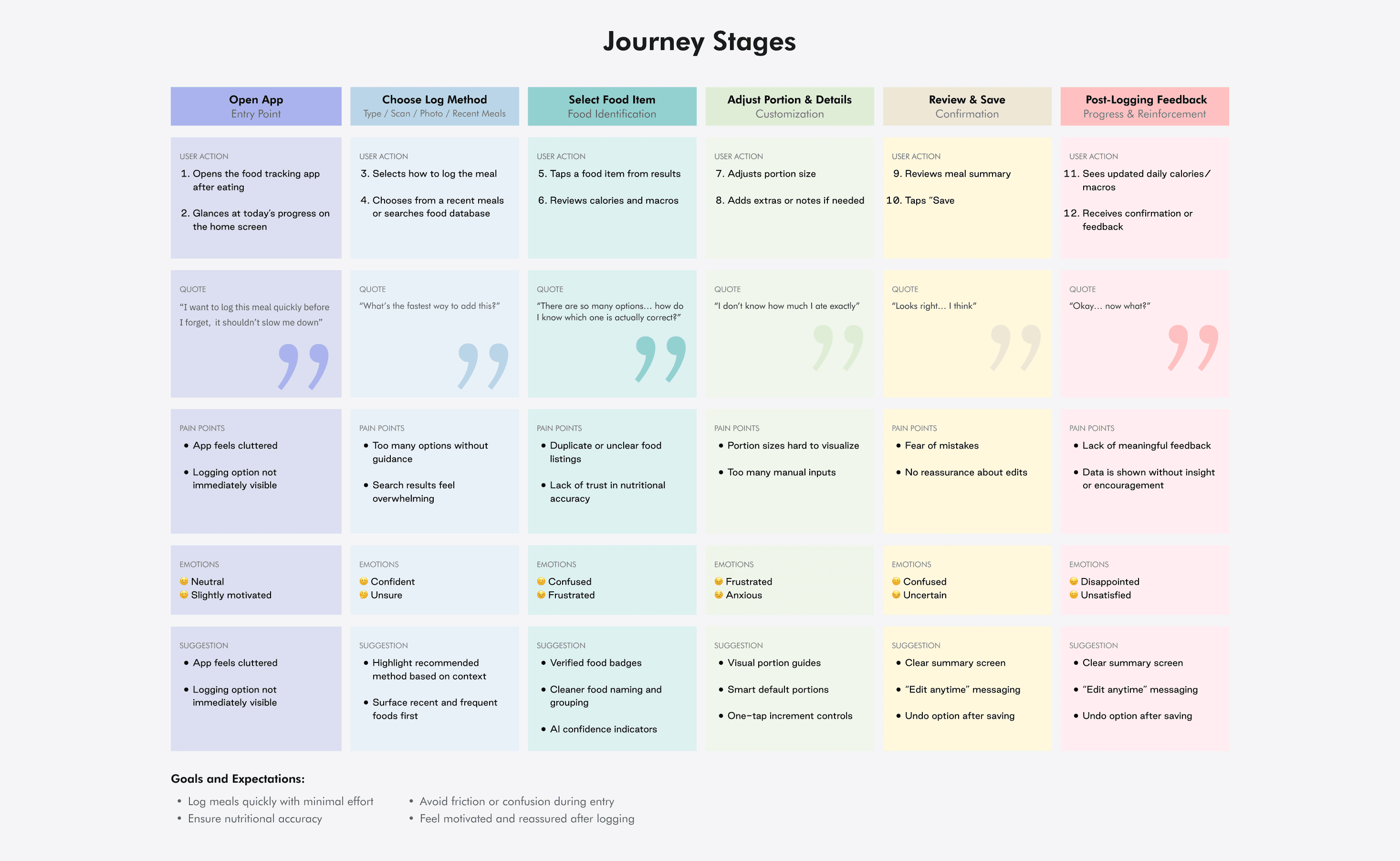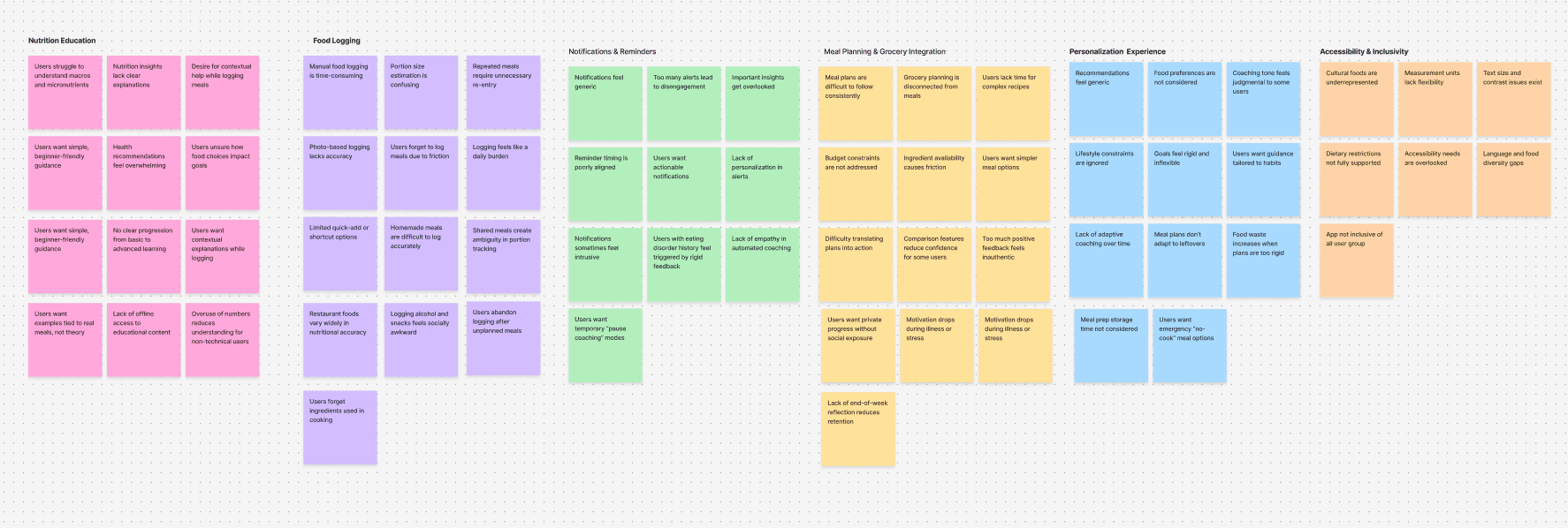 To understand the problem I’m solving with Nutrio, I walked through the user’s journey—pinpointing where they struggle or feel lost. Once I had the journey mapped, I used affinity mapping to organize key themes from what I learned. Then, I analyzed competitors to see how I could make Nutrio stand out.